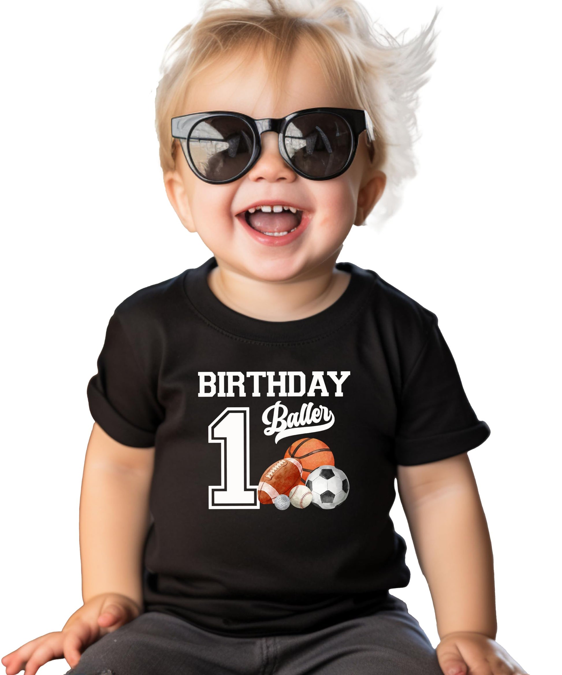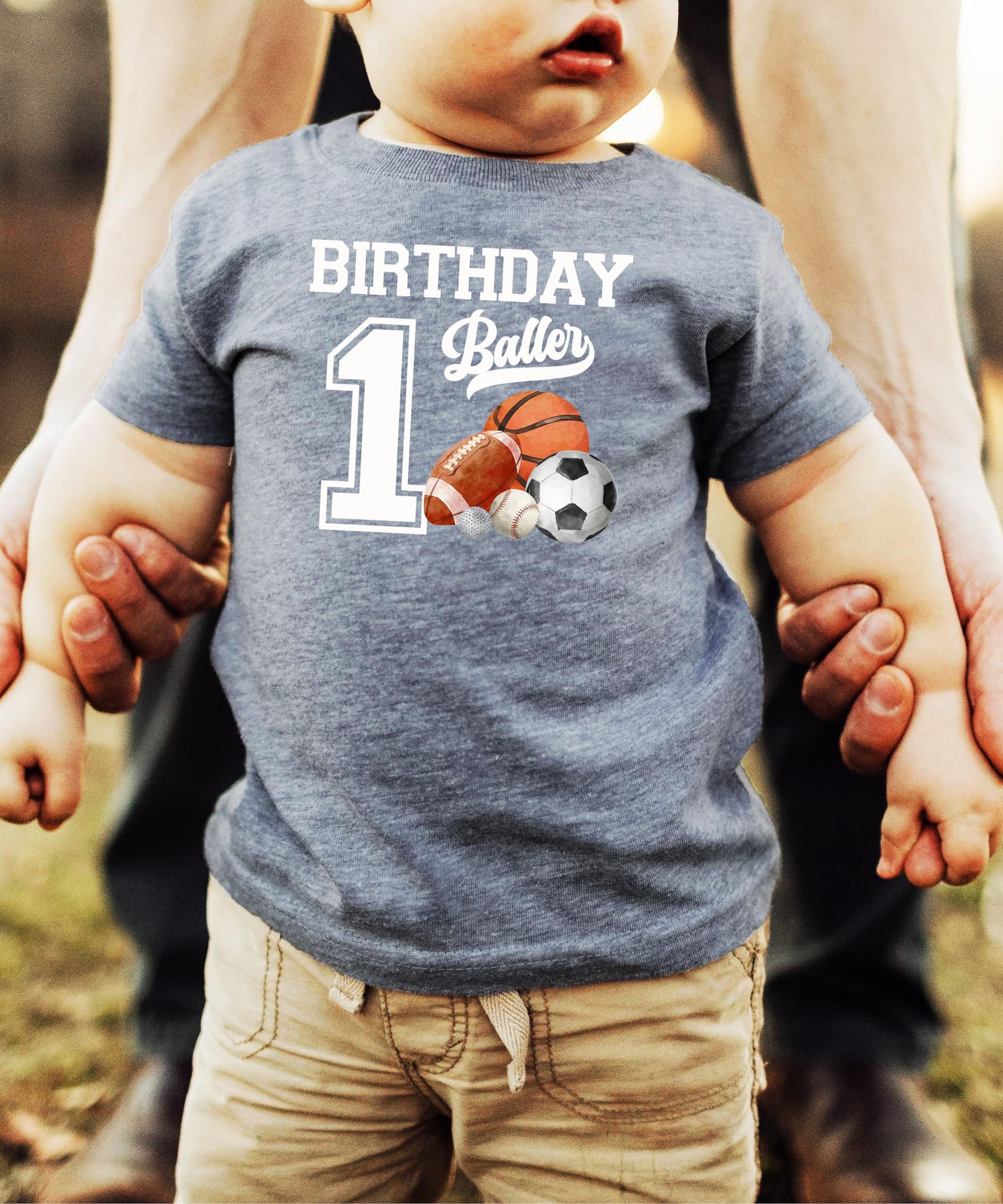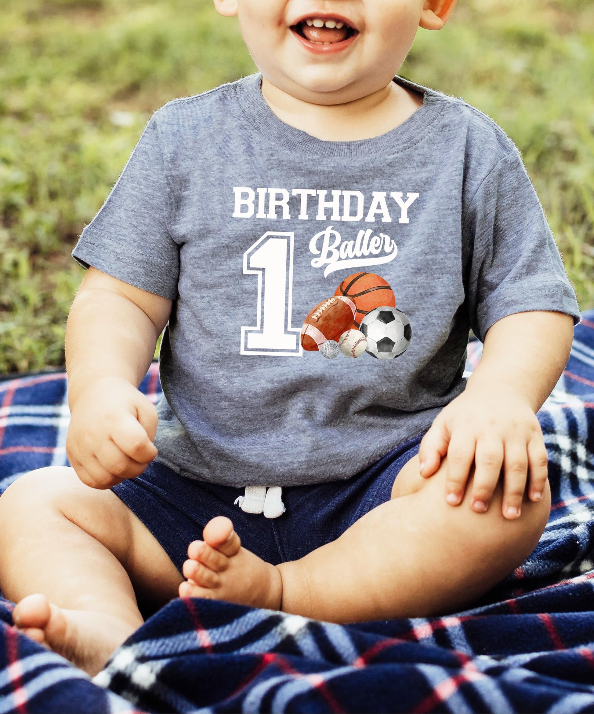 Celebrate your little all-star’s big day with our Birthday Baller sports theme shirt, perfect for his first birthday!