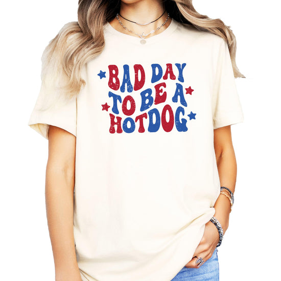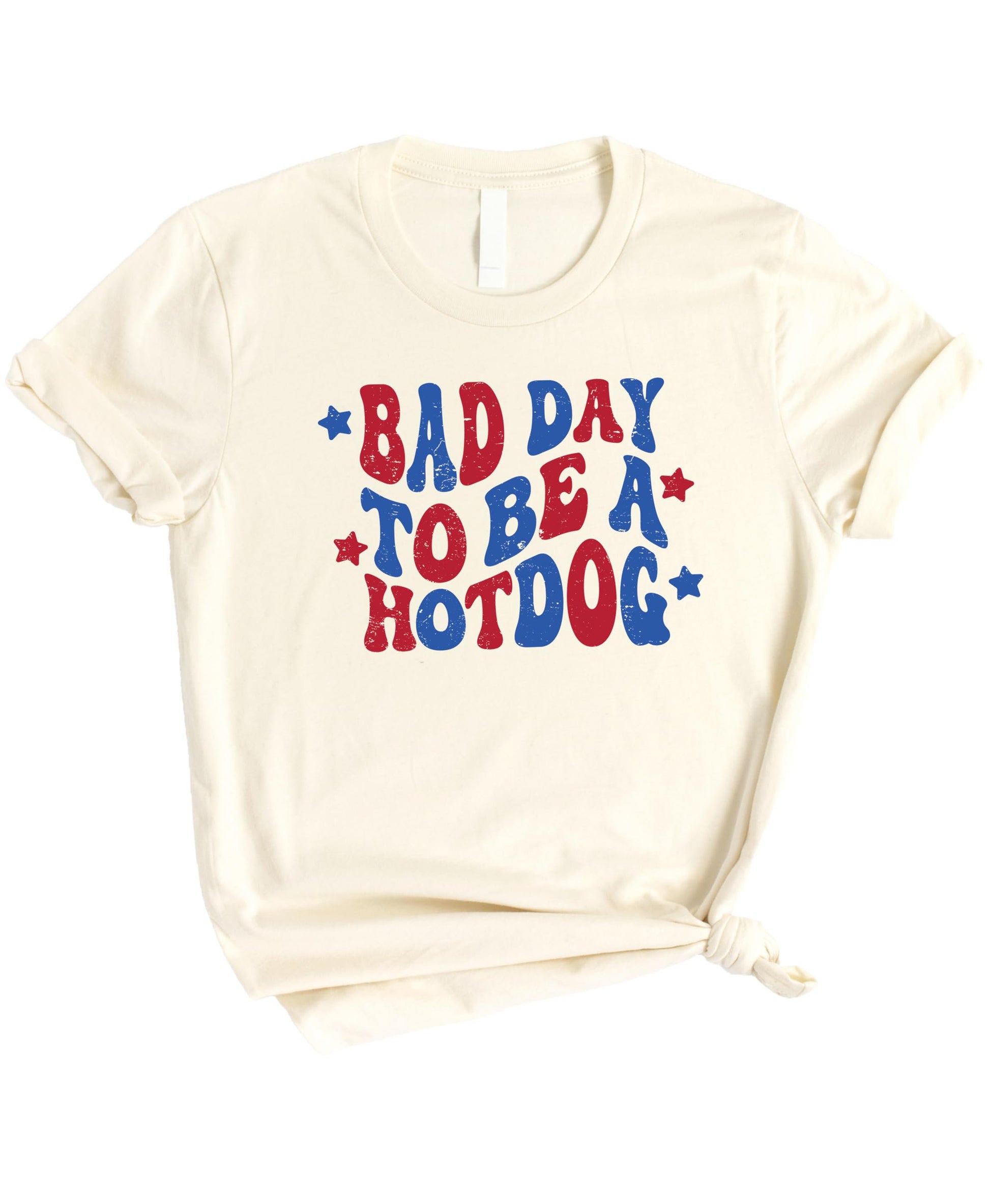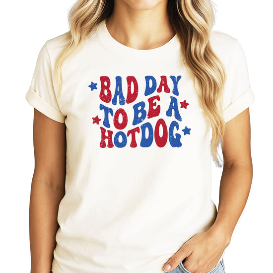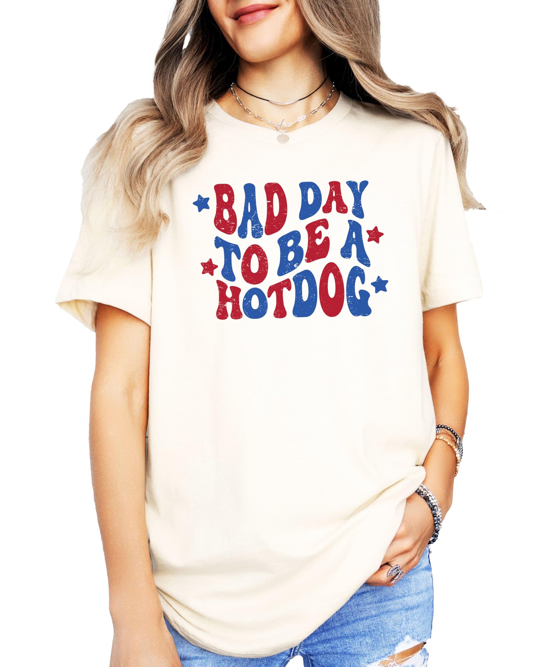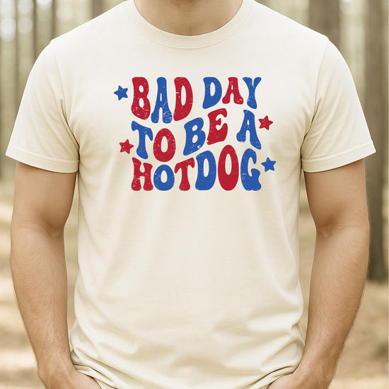 Turn heads at your next BBQ with this hilarious "Bad Day to Be a Hotdog" shirt featuring bold red and blue lettering with patriotic star accents.