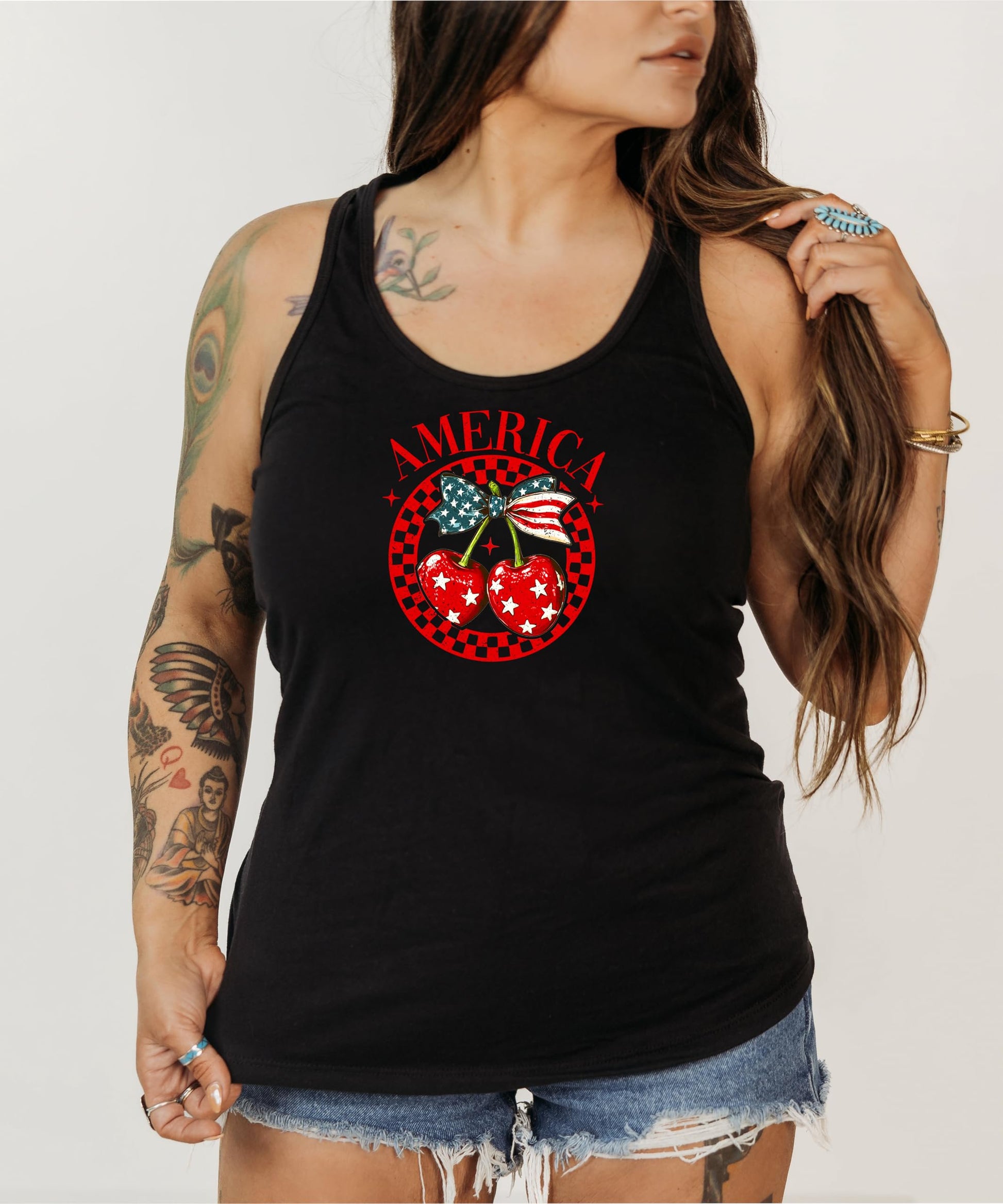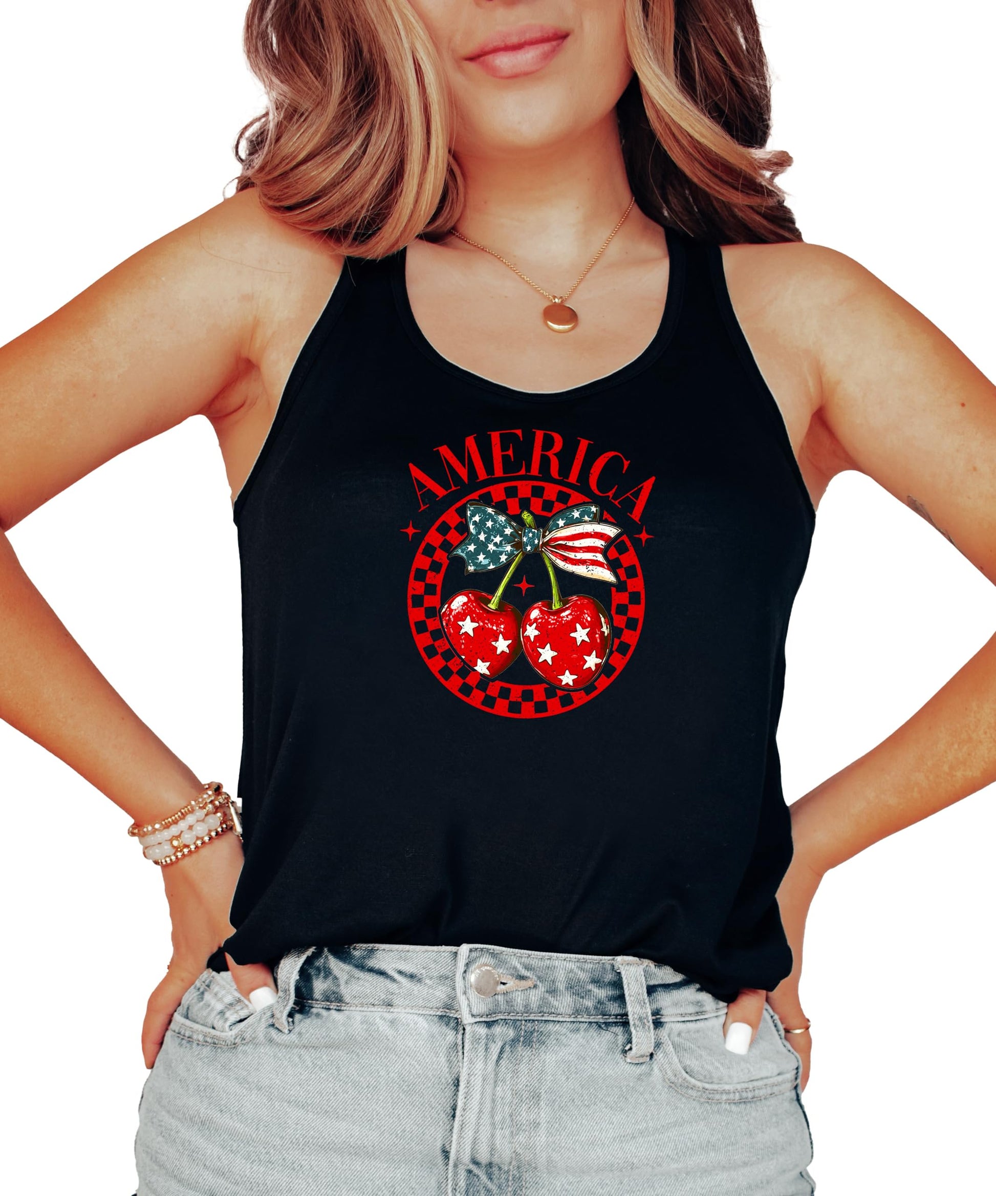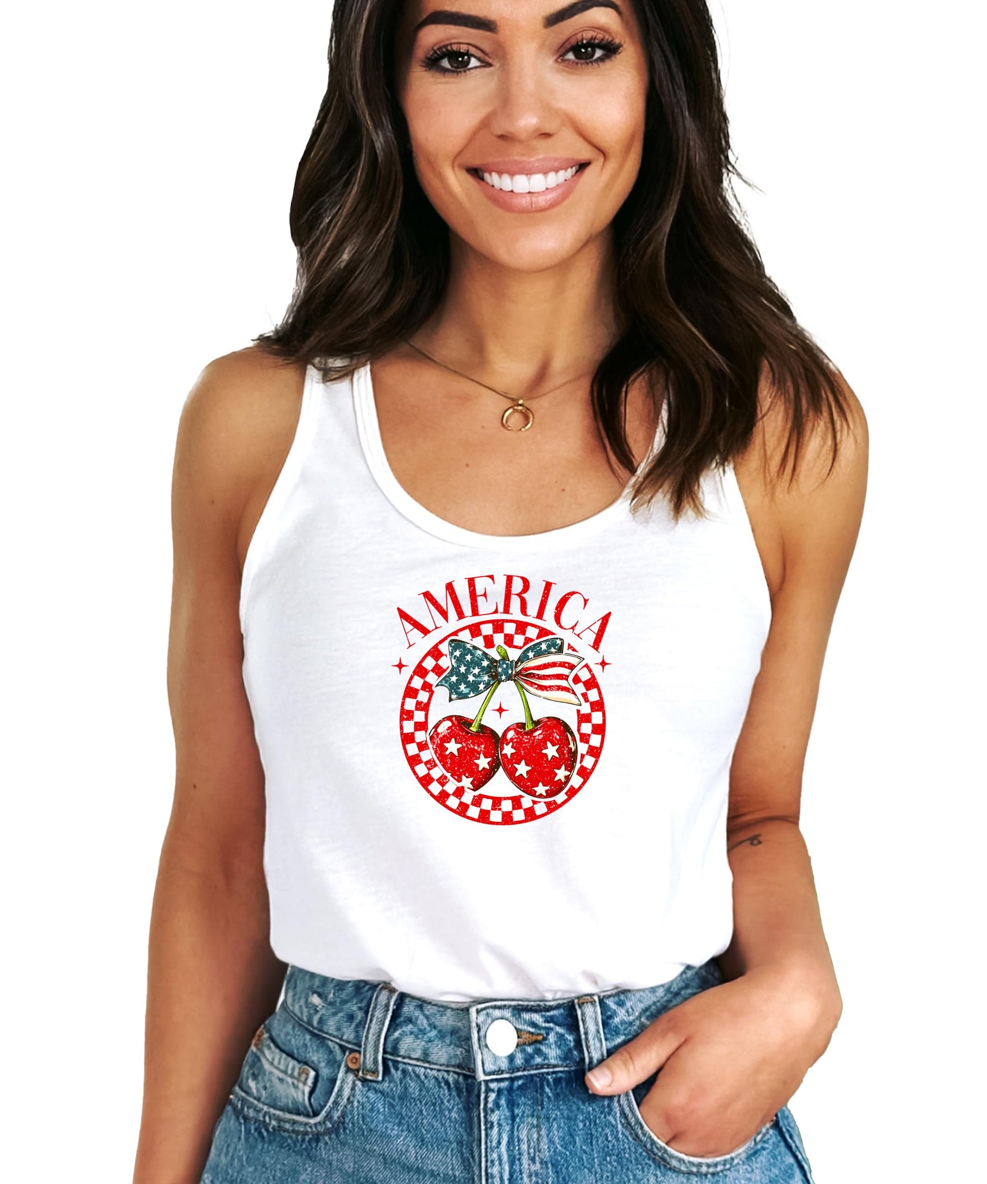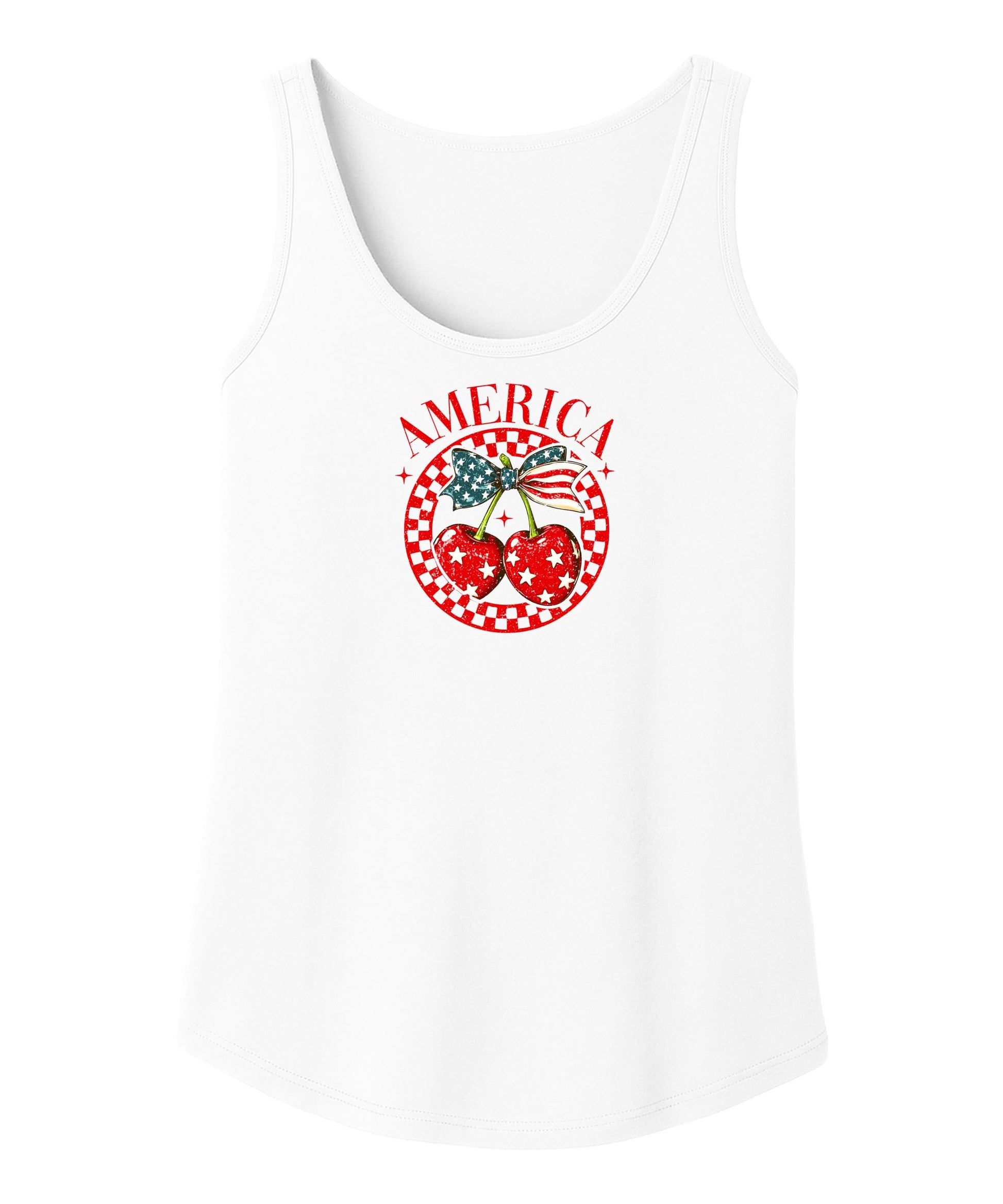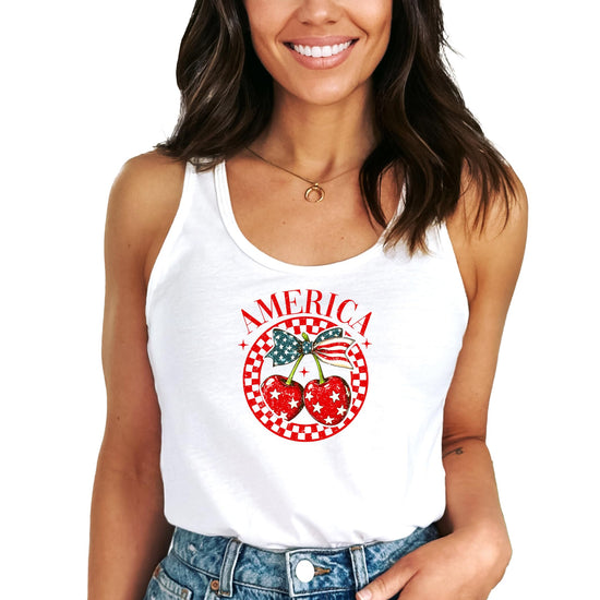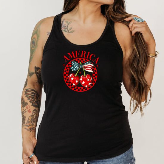 Turn heads this summer with our America Cherry Tank - the perfect blend of girly charm and patriotic pride!