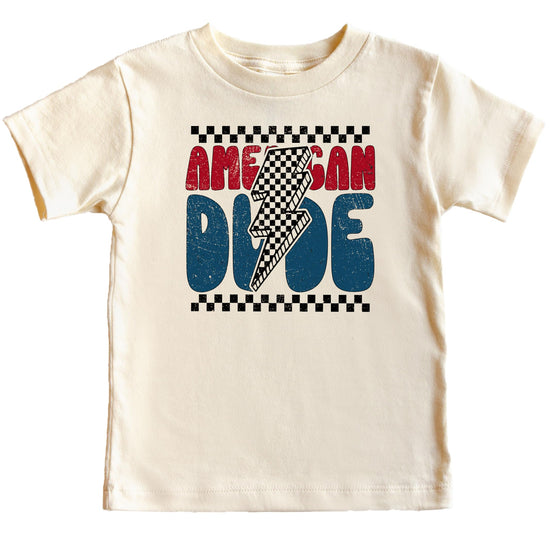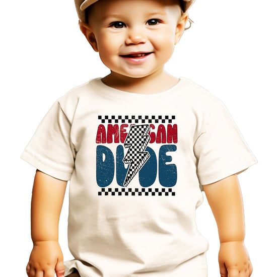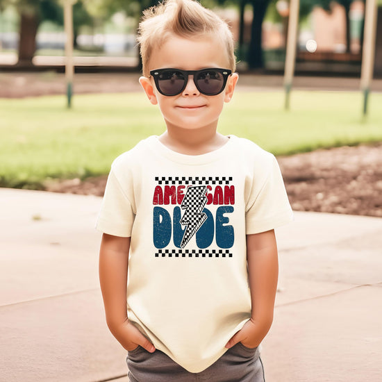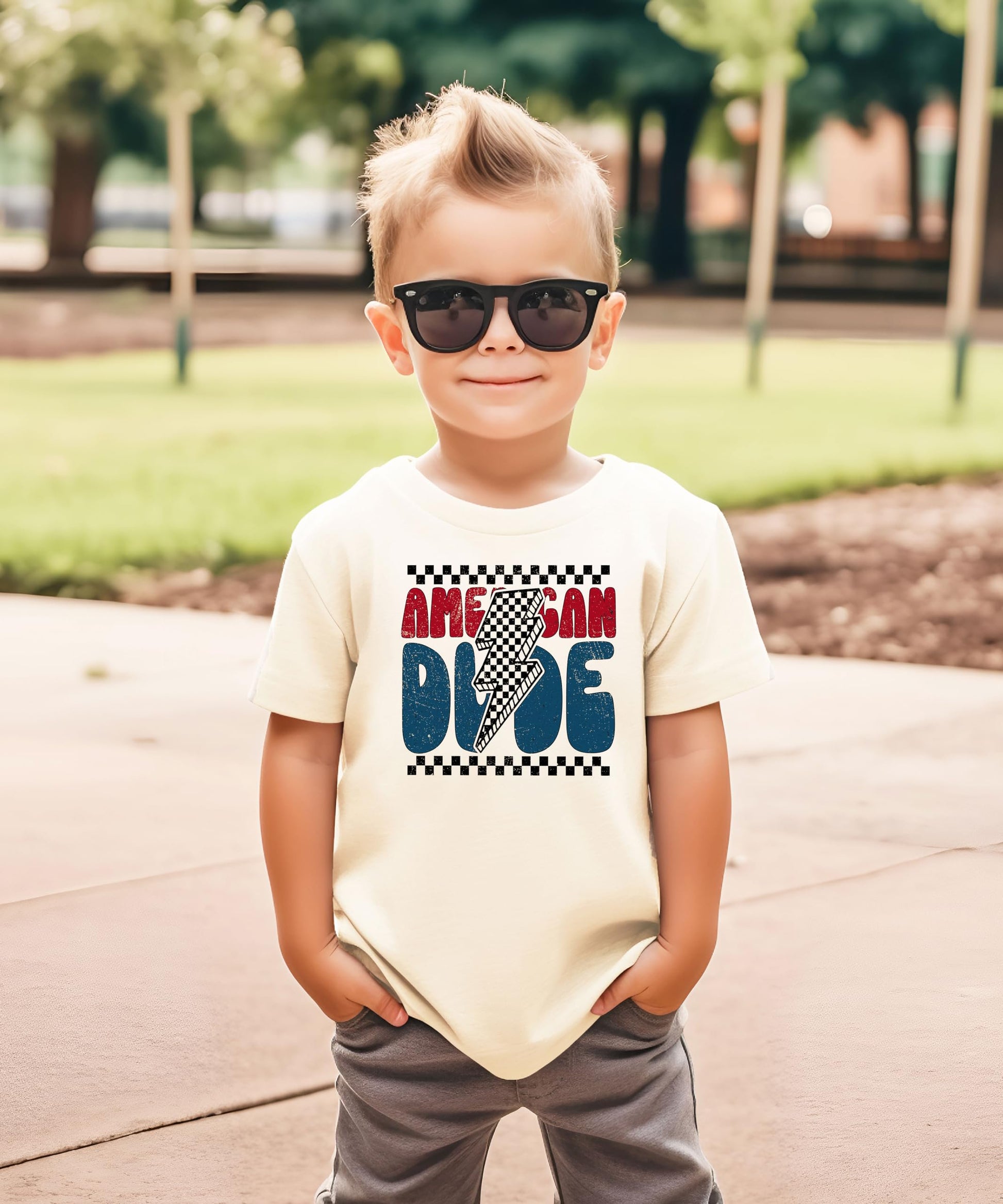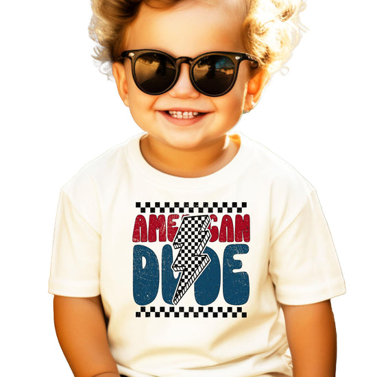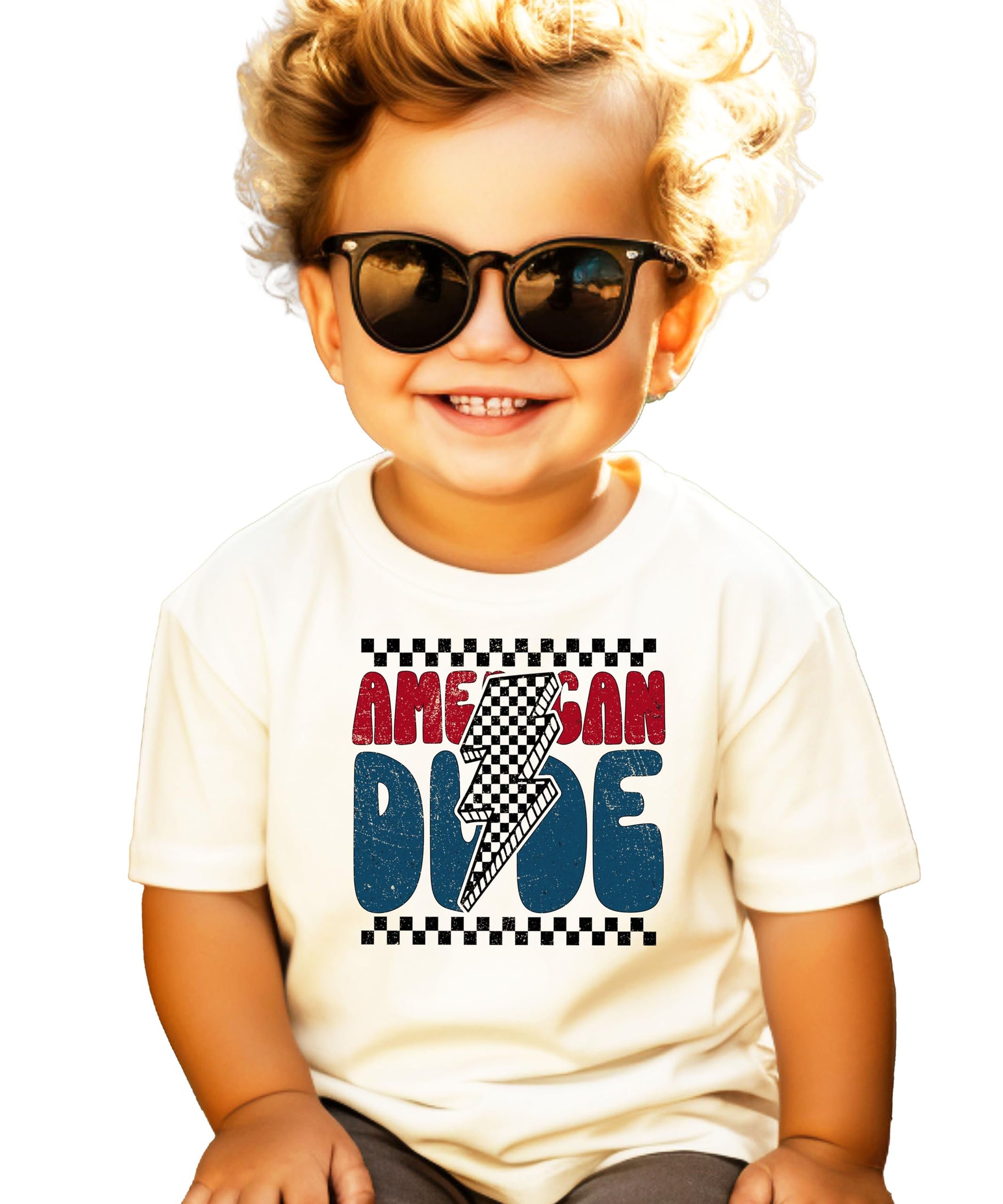 Let your little guy show off his patriotic style with this trendy American Dude lightning bolt tee!